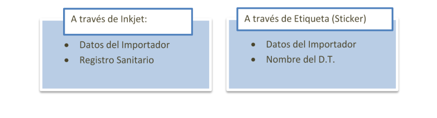 - A través de Inkjet: Datos del importador, registro sanitario, nombre del Director Técnico (D.T.), nombre del laboratorio que reacondiciona.
